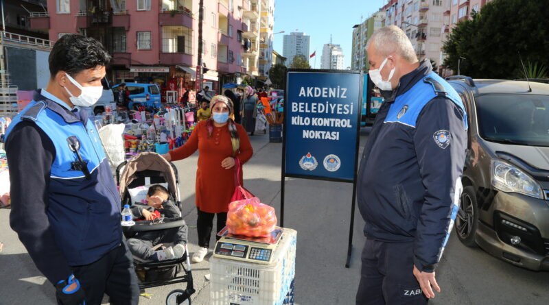 Akdeniz Belediyesi Zabıta Müdürlüğü ekipleri, semt pazarlarında kilogram kontrolü ile birlikte, Koronavirüs salgınına karşı alınan tedbirlere uyulup uyulmadığını da denetledi; maske ve mesafe kurallarına uyulması noktasında esnaf ve alışverişe gelen vatandaşlara sürekli uyarılarda bulundu.
