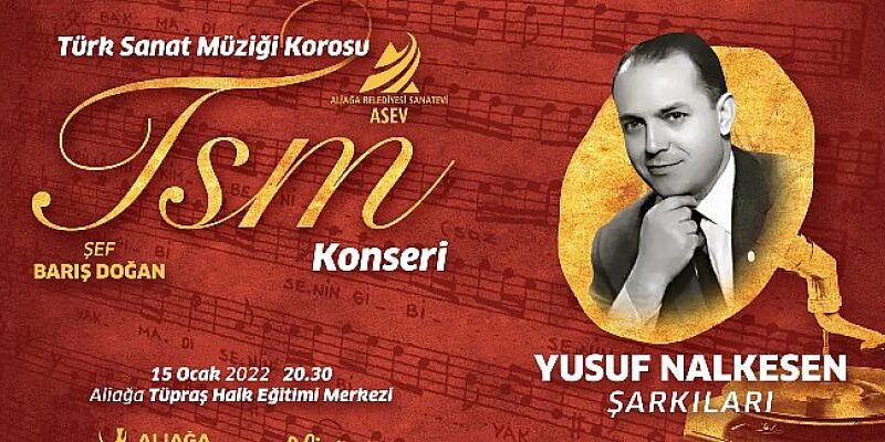 Aliağa Belediyesi Sanat Evi (ASEV) Türk Sanat Müziği (TSM) Korosu, kültür sanat etkinlikleri kapsamında Türk sanat dünyasının en önemli isimlerinden Yusuf Nalkesen’in şarkılarıyla sahne alacak. Şef Barış Doğan yönetimindeki 90 kişilik dev koro musiki severlere unutulmaz bir müzik ziyafeti sunacak.
