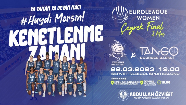 Çukurova Basketbol Kulübü(ÇBK) Mersin Yenişehir Belediyesi, Euroleague Women çeyrek finalinin üçüncü ve son maçına çıkıyor. Fransa temsilcisi Tango Bourges Basket’i sahasında ağırlayacak olan turuncu-lacivertliler kazanması halinde Avrupa’nın en büyük kupası için Final-Four’ayükselecek. Yenişehir Belediye Başkanı Abdullah Özyiğit, sezonun en kritik maçı için Mersinlileri maça davet ederek, destek çağrısında bulundu.