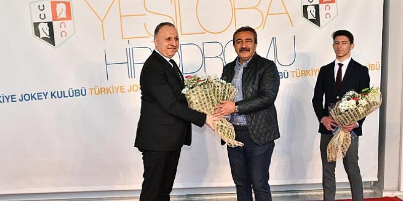Çukurova Belediyesi Başkanı Soner Çetin, at sahibi Ergutay Özyurteri’ne yarış sonrası çiçek verdi ve kupasını takdim etti.