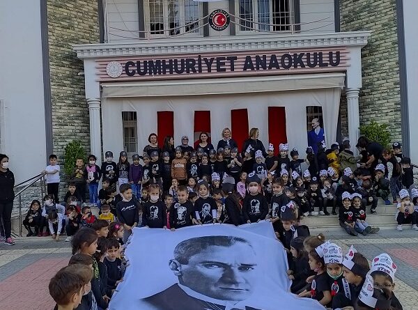 Mersin’in Yenişehir ilçesinde bulunan Cumhuriyet Anaokulu öğrencileri, küçük yüreklerinde büyüttükleri kocaman Atatürk sevgisiyle, anlamlı bir etkinlik düzenledi. Minnet ve rahmetle yurdun her köşesinde anılan Atamızı, Cumhuriyet Anaokulu’nun minik yürekleri sevgi, barış ve özlemle andı. Minikler tarafından el emeğiyle hazırlanan Anıtkabir maketi, okulun giriş kapısında coşkuyla sergilenirken öğrenciler de duygusal anlar yaşadı. Minikler daha sonra Atatürk’ün de olduğu Türk Bayrağı’na çiçekler bırakarak Ata’yı yâd etti. Daha sonra büyük bir Atatürk resmi açan Cumhuriyet çocuklarının Ata’yı selamlamasıyla devam eden etkinlik, fotoğraf çekimlerinin ardından sona erdi.