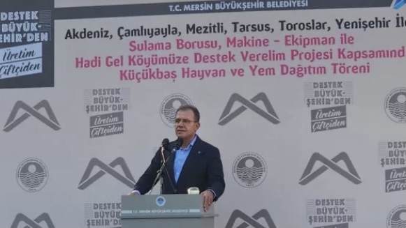 Mersin Büyükşehir Belediye Başkanı Vahap Seçer, çiftçilere sulama borusu ve küçükbaş hayvan dağıtımı törenine katıldı.