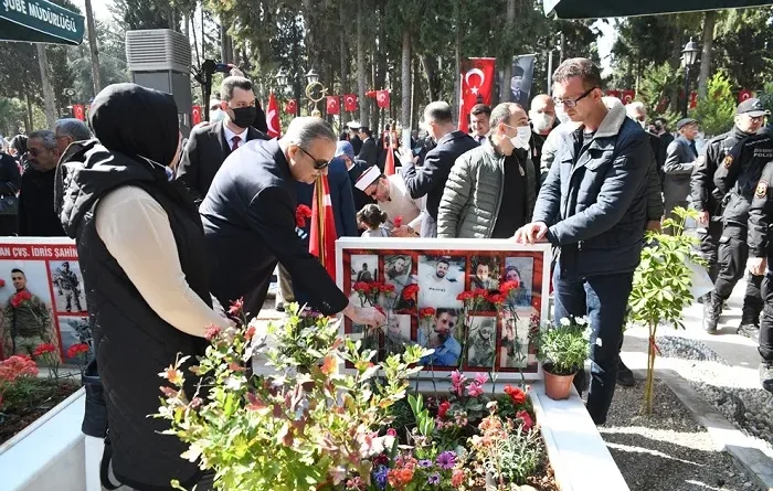 Törende daha sonra şehitlik önünde Kur’an-ı Kerim tilaveti yapılarak dualar okundu. Anma programında Vali Ali İhsan Su ve beraberindekiler, şehitlerimizin kabirlerine karanfil bıraktı. Mersin Şehitliği’nde düzenlenen programa Vali Ali İhsan Su’nun yanı sıra; Mersin Milletvekili Alpay Antmen, Akdeniz Bölge ve Garnizon Komutanı Tuğamiral Fuat Gedik, Büyükşehir Belediyesi Başkanı Vahap Seçer, Cumhuriyet Başsavcısı Tolgahan Öztoprak, Türkiye Harp Malulü Gaziler Şehit, Dul ve Yetimleri Derneği Mersin Şube Başkanı Fatih Tuncer, il protokolü üyeleri, kamu kurum ve kuruluş ile STK temsilcileri, şehitlerimizin aileleri, gaziler ve öğrenciler katıldı.