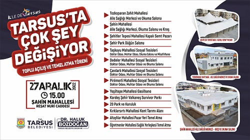 Tarsus Belediyesi tarafından; Tozkoparan Zahit Mahallesi aile sağlığı merkezi ve okuma salonu, Şahin Mahallesi aile sağlığı merkezi, okuma salonu ve kreş, Şehitler Tepesi Mahallesi kapalı semt pazarı, Şehir Park Düğün Salonu, Taşkuyu, Dedeler, Çavdarlı, Piriömerli Mahallelerinde sosyal tesisler, Yeşiltepe Mahallesi gasilgane, Kardeş Şehir Valkaneş Survivor Parkı, Kırklarsırtı Mahallesi Kent Tarım Alanı ve 20 park ile koruluk açılıyor. Altaylılar Mahallesi pazar yeri ve Türkiye’de bir ilkin gerçekleştirileceği Öğretmenler Mahallesi Sağlık Yerleşkesinin ise temelleri atılıyor. Tarsus Belediyesi tarafından yapılan açıklamada, “27 Aralık Salı günü saat 15.00 da gerçekleştirecek olduğumuz açılış ve temel atma törenine tüm halkımız davetlidir. ” ifadeleri kullanıldı.