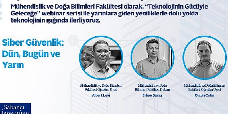 Sabancı Üniversitesi, bilim ve teknoloji alanındaki araştırma alanları ile ilgili bilgi birikimini kamu ve özel sektör ile paylaşmak üzere “Teknolojinin Gücüyle Geleceğe” Webinar Serisi’nin 2022 programını başlatıyor. Webinar Serisi’nin ilk semineri Mühendislik ve Doğa Bilimleri Fakültesi (MDBF) Dekanı Erkay Savaş ve MDBF Öğretim Üyeleri Albert Levi ve Orçun Çetin tarafından “Siber Güvenlik: Dün, Bugün ve Yarın” konusunda gerçekleşecek. 15 Mart Salı günü gerçekleşecek “Siber Güvenlik: Dün, Bugün ve Yarın” webinarı katılımcılara siber güvenlik bilinci kazandırmayı ve kendilerini/şirketlerini siber güvenlik ile ilgili sorunlardan nasıl koruyacaklarını göstermeyi amaçlıyor. Webinarda geleceğin siber güvenlik problemleri hakkında bilgiler de paylaşılacak.