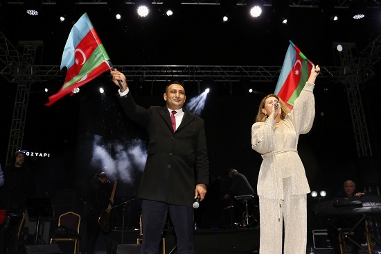 Konserde “Çırpınırdı Karadeniz” ve “Ölürüm Türkiyem” gibi birçok sevilen eserleri seslendiren Azerin’e Türk ve Azerbaycanlı vatandaşlar hep birlikte eşlik etti. Başkan Yılmaz da sahne önünde vatandaşlarla birlikte bu coşkuya ortak oldu. Daha sonra sahneye çıkan Başkan Yılmaz, bayraklar eşliğinde Azerin ile birlikte İzmir Marşı’nı okudu.