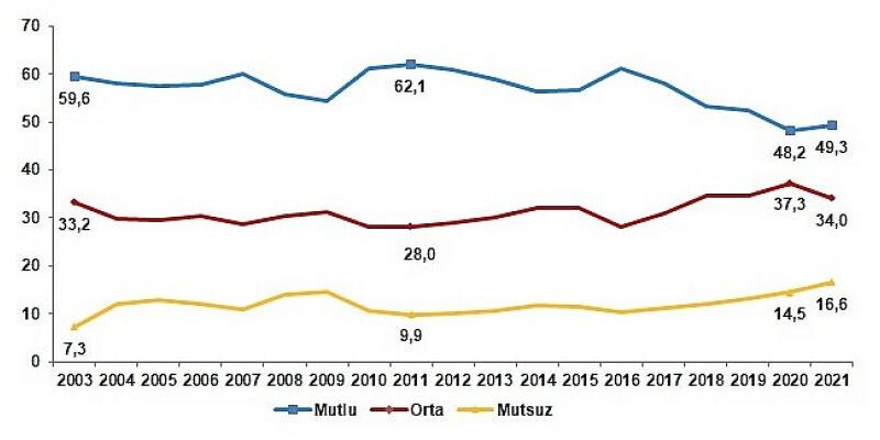 Mutlu olduğunu beyan eden 18 ve üzeri yaştaki bireylerin oranı, 2020 yılında 48,2 iken 2021 yılında 49,3 oldu. Mutsuz olduğunu beyan eden bireylerin oranı ise 2020 yılında 14,5 iken 2021 yılında 16,6 oldu.